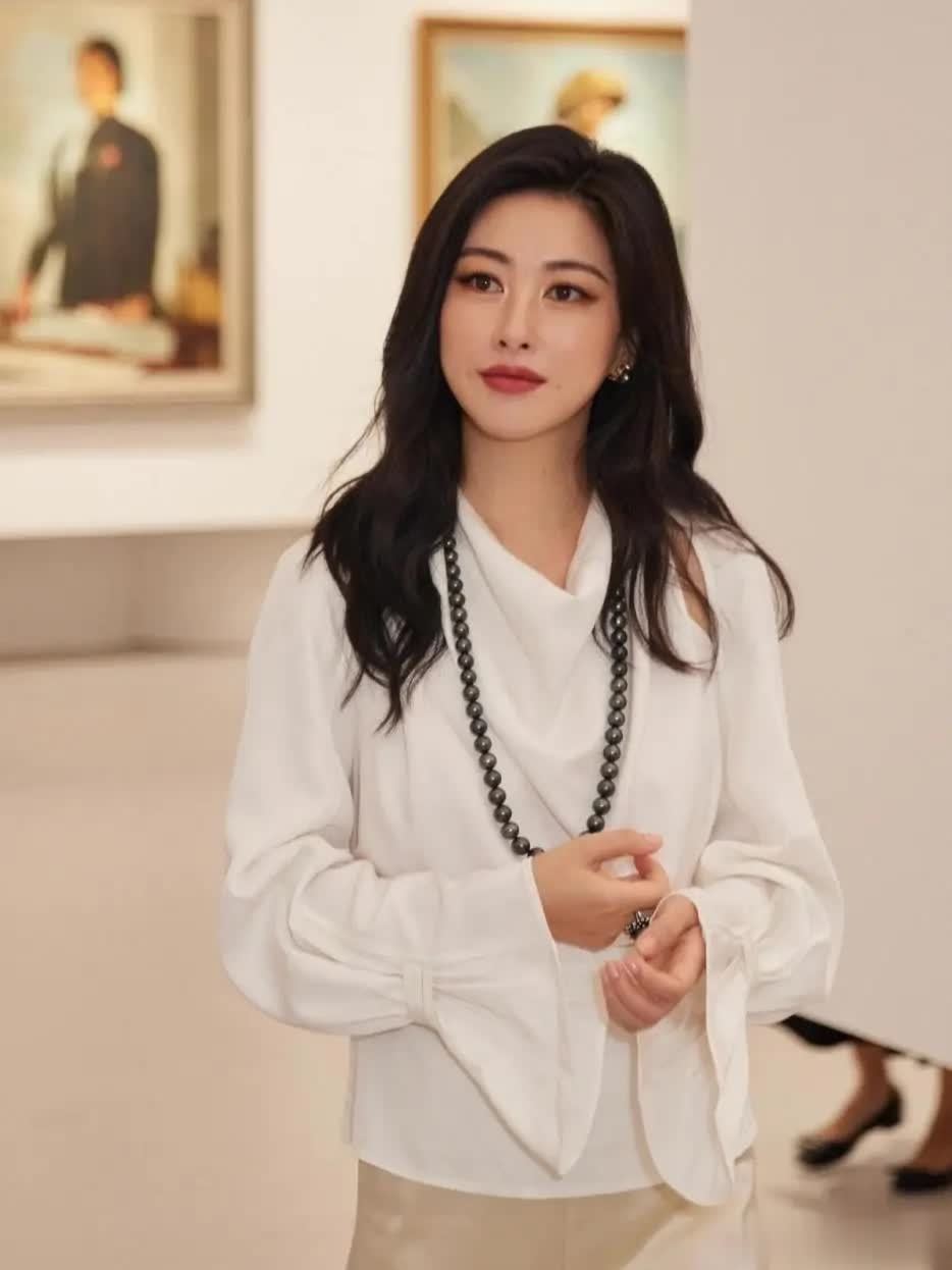白上衣的领口采用堆堆领设计,柔软地堆在颈间,自带温柔氛围感,还能巧妙修饰脖颈线条。面料看起来顺滑亲肤,垂感极佳,贴身穿想必十分舒适。袖子是极具设计感的喇叭袖,袖口做了收褶处理,走起路来随风摇曳,慵懒又贵气,还能将手臂上的肉肉隐藏得严严实实。